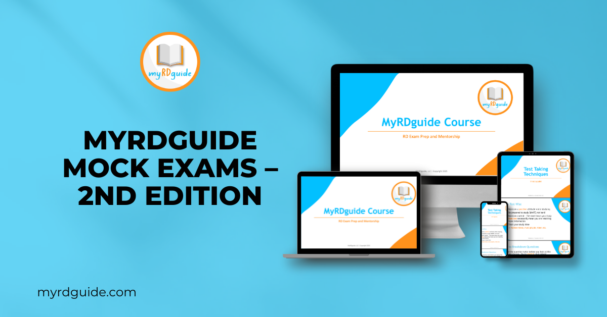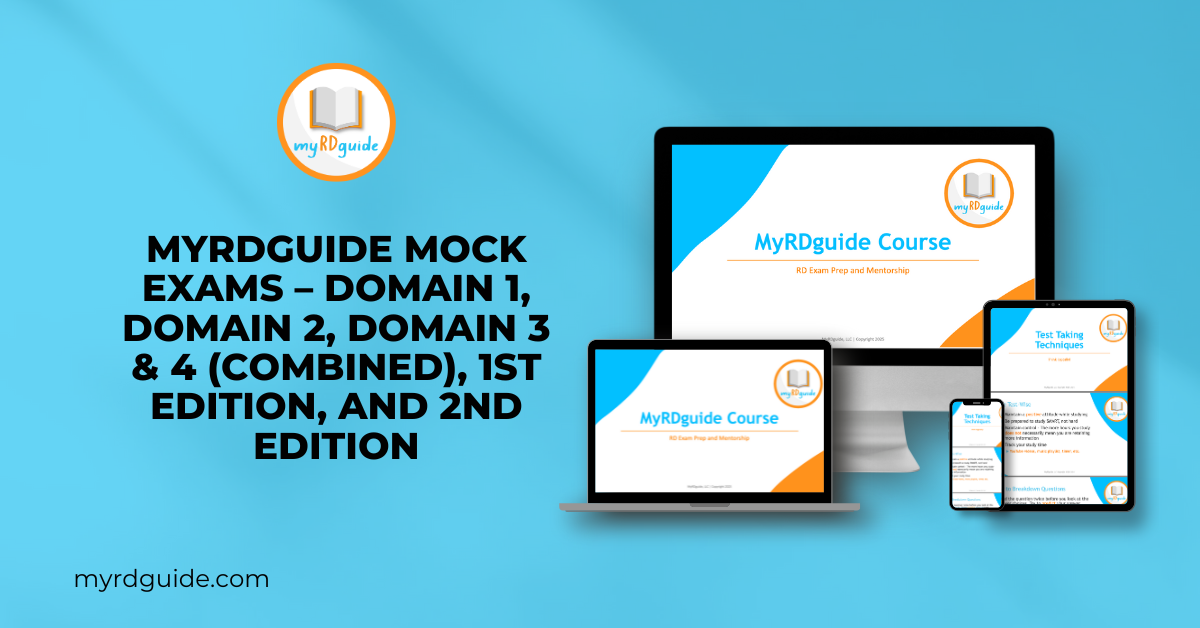 Get the ultimate exam-day simulation with five mock exams covering all RD exam domains. These exams are designed to strengthen your critical thinking, stamina, and time management, so you walk into exam day confident and prepared. You’ll be able to target each domain individually with one mock exam for Domain I, one for Domain II, one for Domains III & IV, plus two comprehensive full-length mock exams that integrate all domains—just like the real RD exam. Over 570 practice questions total to help you assess readiness, identify gaps, and build exam-day confidence.